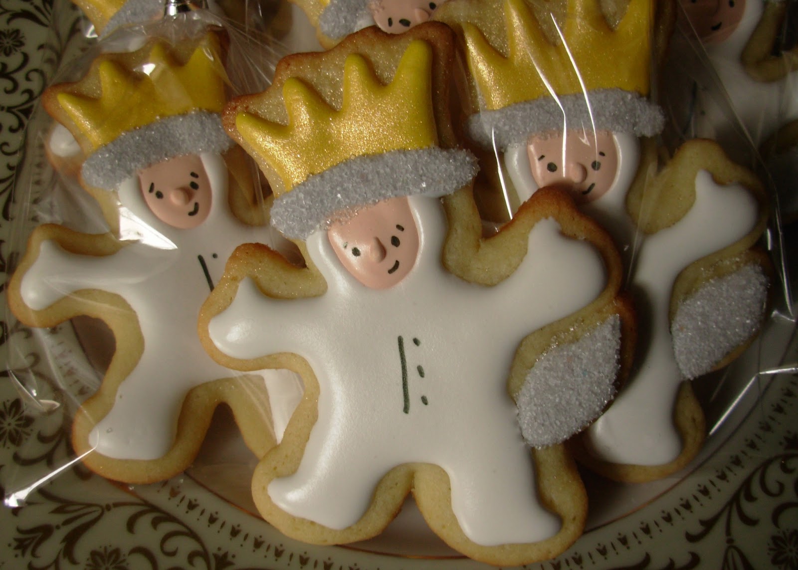 and i was all, "uh oh, i never read that book." it's true, it was always checked out by other kids and i never got my turn (lip quiver) no, it was always checked out, but i just read other stuff. i knew the pictures, and the movie previews looked awesome, but still, never read it. so i Googled for pictures and discovered that my "Frosty the Snoman" plus a mini crown, plus a leaf for a tail, meant that the main character would be a snap. those monsters? (were they called "monsters"?) they were many and intricate, and while i have to admit i took the easy route, it is a book about/ a shower for a little boy [and if you know little boys, they're all "main characters."], and when i dropped them off, Mary Jo said that any stuff they found for the party was always the monsters--nothing about the kid. so now they have him, featured as a cookie!